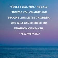 Matthew 18 Verse 3: “’assure you,’ He said, ‘unless you are converted’ and become like children, you will never enter the kingdom of heaven’.”