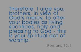 Romans 12 verse 1: “Therefore, brothers {and sisters} by the mercies of God, I urge you to present your bodies as a living sacrifice, holy and pleasing to God; this is your spiritual worship”.