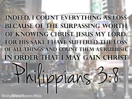 Philippians 3 verse 8: “More than that, I also consider everything to be a loss in view of the surpassing value of knowing Christ Jesus my Lord. Because of Him I have suffered the loss of all things and consider them fifth so I may gain Christ.”