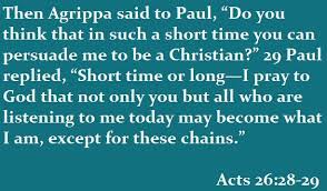 Acts 26 Verse 29: ‘ I wish before God’, replies Paul, ‘that whether easily or with difficulty, not only you but all who listen to me today might become as I am–except for these chains.”
