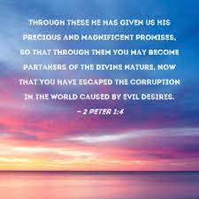 2 Peter 1 Verse 4: “By these He has given us very great and precious promises, so that through them you may share in the divine nature, escaping the corruption that is in the world because of evil desires”.