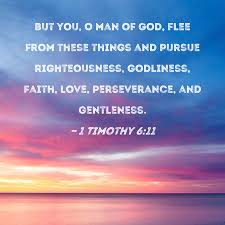 1 Timothy 6 verse 11; “But thou, O man {O woman} of God, flee these things; and follow after righteousness, godliness, faith, love, patience, meekness”.